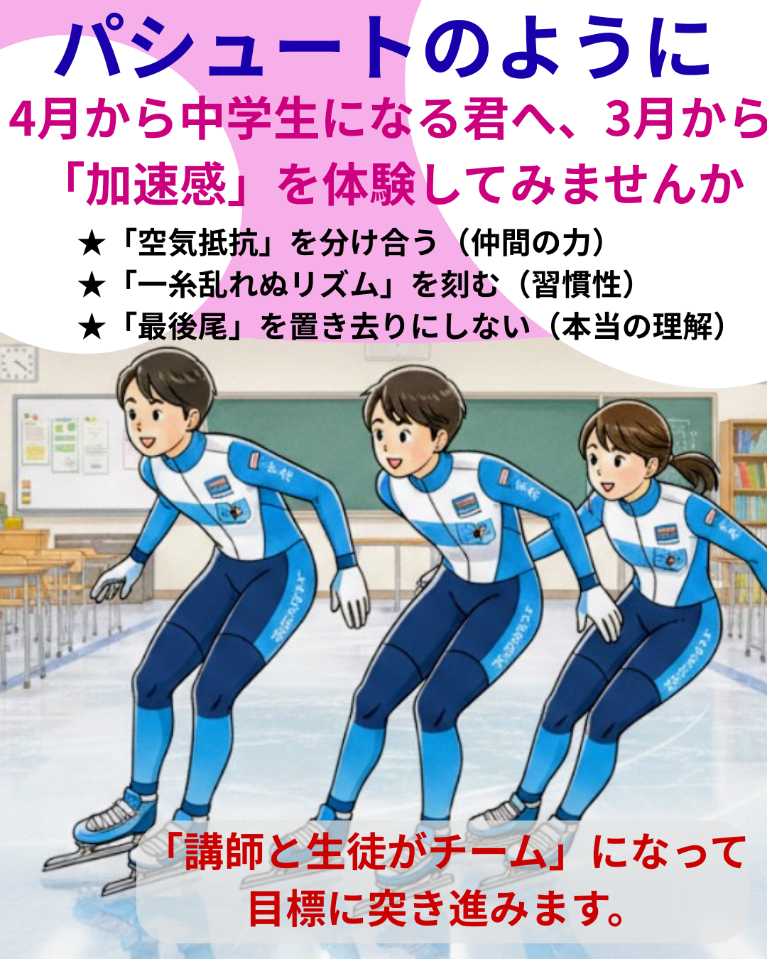パシュート(団体追い抜き)という競技知っていますか。一列になって氷上を駆け抜けるあの競技には、実は「勉強で成功するコツ」が詰まっています。下記にパシュートから学ぶ3つの要素を書き出しました。参考にしてください。さくらば塾の教え方は一斉授業方式です。その中で確実に言えることは一人で勉強して覚える知識と人に伝えて覚える知識では絶対的な違いがあるということです。さくらば塾へ来ませんか?